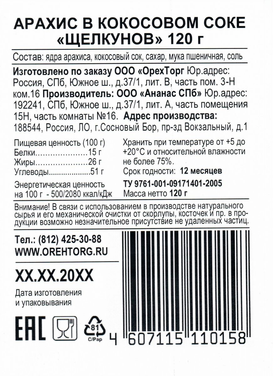 - Состав Ядра арахиса, кокосовый сок, сахар, мука пшеничная, соль