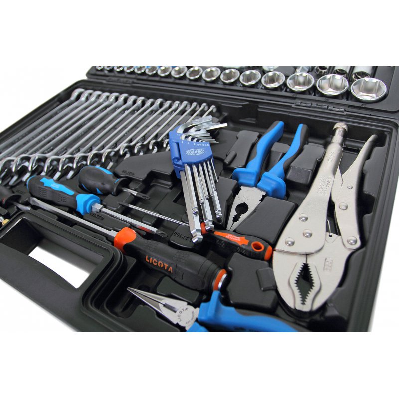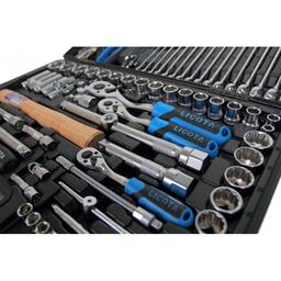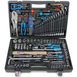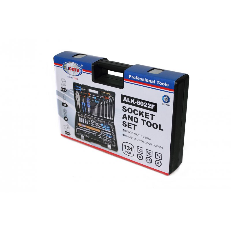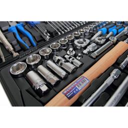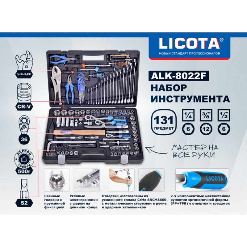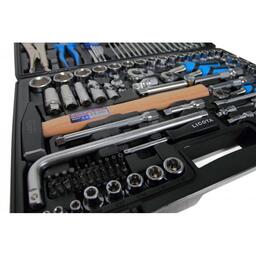 Универсальный набор инструментов включает 131 предмет, среди которых торцевые головки с разным размером привода, переходники, удлинители и др. Одним из основных материалов изгоготовления выступает хром-ванадиевая сталь, которая характеризуется длительным сроком сслужбы и стойкостью к коррозии.