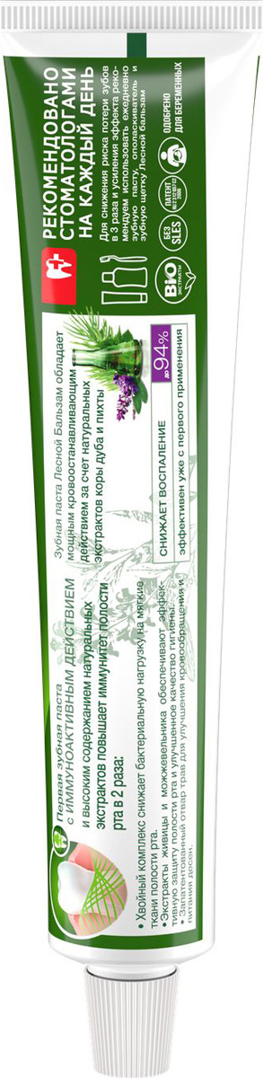 • Состав: Aqua, Sorbitol, Silica, Sodium Lauryl Sulfate, Cellulose Gum, Aroma, Salvia Officinalis (Sage) Leaf Extract*, Aloe Barbadensis Leaf Juice*, Abies Sibirica Leaf Extract*, Picea Leaf Extract*, Pine Leaf Extract*, Polyprenol*, Urtica Dioica (Nettle) Leaf Powder*, Chamomilla Recutita (Matricaria) Flower Extract*, Achillea Millefolium Extract*, Hypericum Perforatum Flower/Leaf/Stem Extract*, Chelidonium Majus Extract*, Sodium Monofluorophosphate, Citric Acid, Glycerin, Menthol, Phenoxyethanol, Sodium Benzoate, Sodium Chloride, Sodium Hydroxide, Sodium Saccharin, Sodium Sulfate, Sodium Sulfite, Eugenol, Limonene, Linalool, CI 19140, CI 42090, CI 77891.