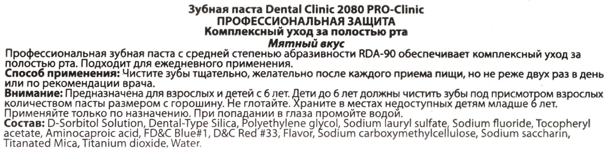 - Состав: D-Sorbitol Solution, Dental-Type Silica, Polyethylene glycol, Sodium lauryl sulfate, Sodium fluoride, Tocopheryl acetate, Aminocaproic acid, FD&C Blue#1, D&C Red#33, Flavor, Sodium carboxymethylcellulose, Sodium saccharin, Titanated Mica, Titanium dioxide, Water.