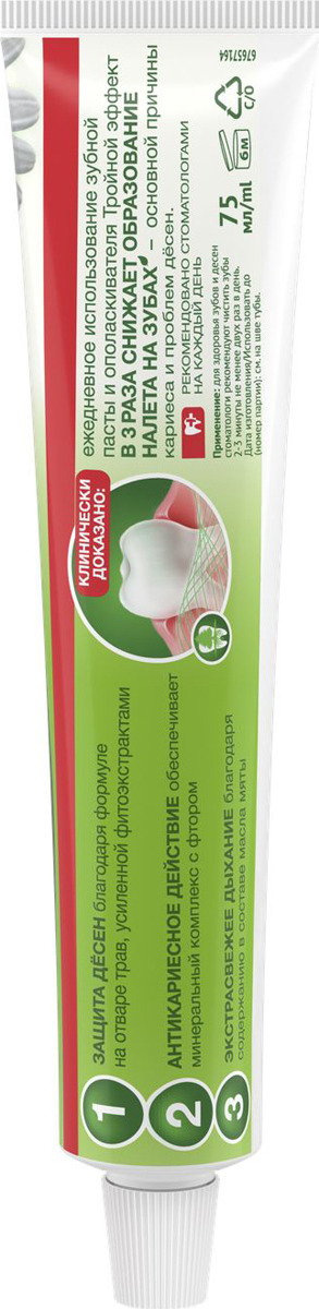 • Состав: Aqua, Silica, Sorbitol, Sodium Lauryl Sulfate, Cellulose Gum, Aroma, Abies Sibirica Leaf Extract, Ribes Nigrum (Black Currant) Leaf Extract (экстракт листьев черной смородины), Mentha Piperita (Peppermint) Leaf Extract (экстракт мяты), Urtica Dioica (Nettle) Leaf Powder, Chamomilla Recutita (Matricaria) Flower Extract, Achillea Millefolium Extract, Hypericum Perforatum Flower/Leaf/Stem Extract, Chelidonium Majus Extract, Sodium Fluoride, Sodium Monofluorophosphate, Benzyl Alcohol, Citric Acid, Glycerin, Glycine Soja (Soybean) Oil, Phenoxyethanol, Sodium Chloride, Sodium Hydroxide, Sodium Saccharin, Sodium Sulfate, Limonene, Linalool, CI 19140, CI 42090, CI 73360, CI 74160, CI 74260, CI 77891.
