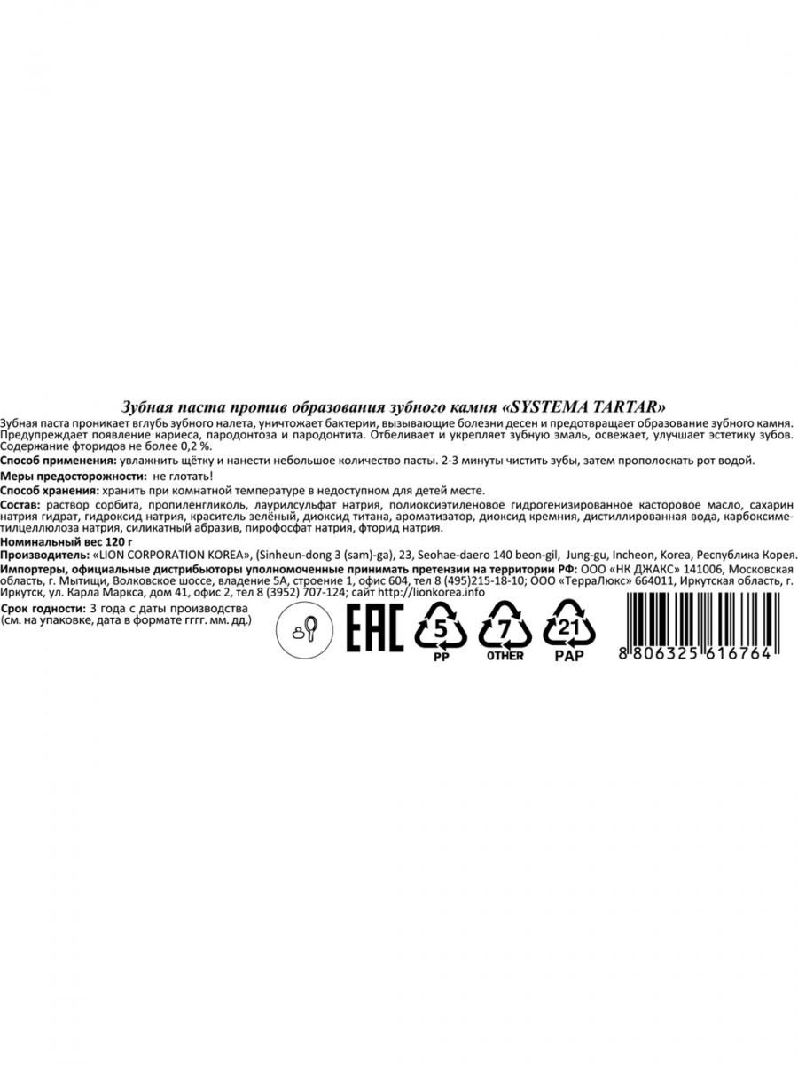 - Способ применения: Увлажнить щётку и нанести небольшое количество пасты. 2-3 минуты чистить зубы, затем прополоскать рот водой. Меры предосторожности: храните пасту в закрытом тюбике в недоступном для детей месте.