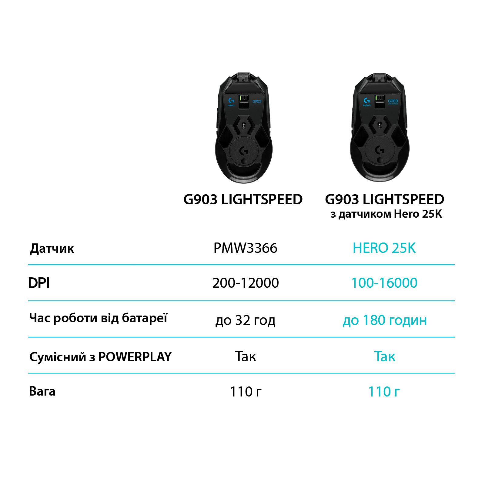 Крім високої точності, датчик HERO 16K відрізняється фантастичною енергоефективністю: час роботи батареї досягає 140 годин при використанні всіх можливостей RGB-підсвічування за технологією LIGHTSYNC і 180 годин - без підсвічування. За цим параметром нова модель перевершує миша G903 попереднього покоління майже в 6 разів.