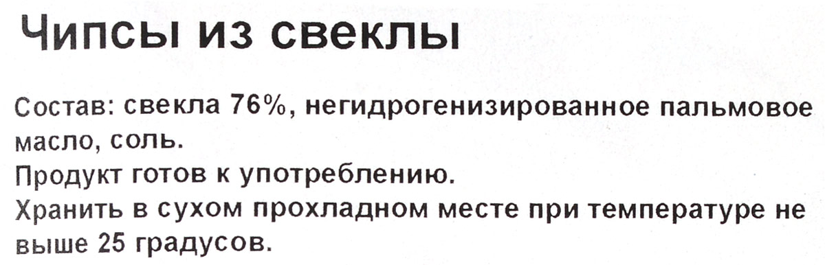 - Состав Свекла 76%, масло пальмовое негидрогенизированное, соль.