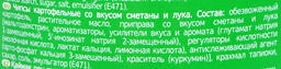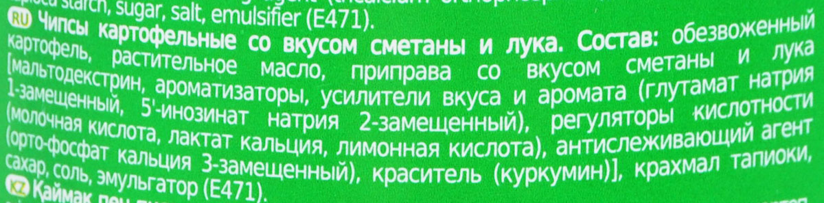 - Состав: Обезвоженный картофель, растительное масло, приправа со вкусом сметаны и лука, мальтодекстрин, ароматизаторы, усилители вкуса и аромата (глутамат натрия 1-замещенный, 5'-инозинат натрия 2-замещенный), регуляторы кислотности (молочная кислота, лактат кальция, лимонная кислота), антислеживающий агент (орто- фосфат кальция 3-замещенный), краситель (куркумин), крахмал тапиоки, сахар, соль, эмульгатор (Е471).