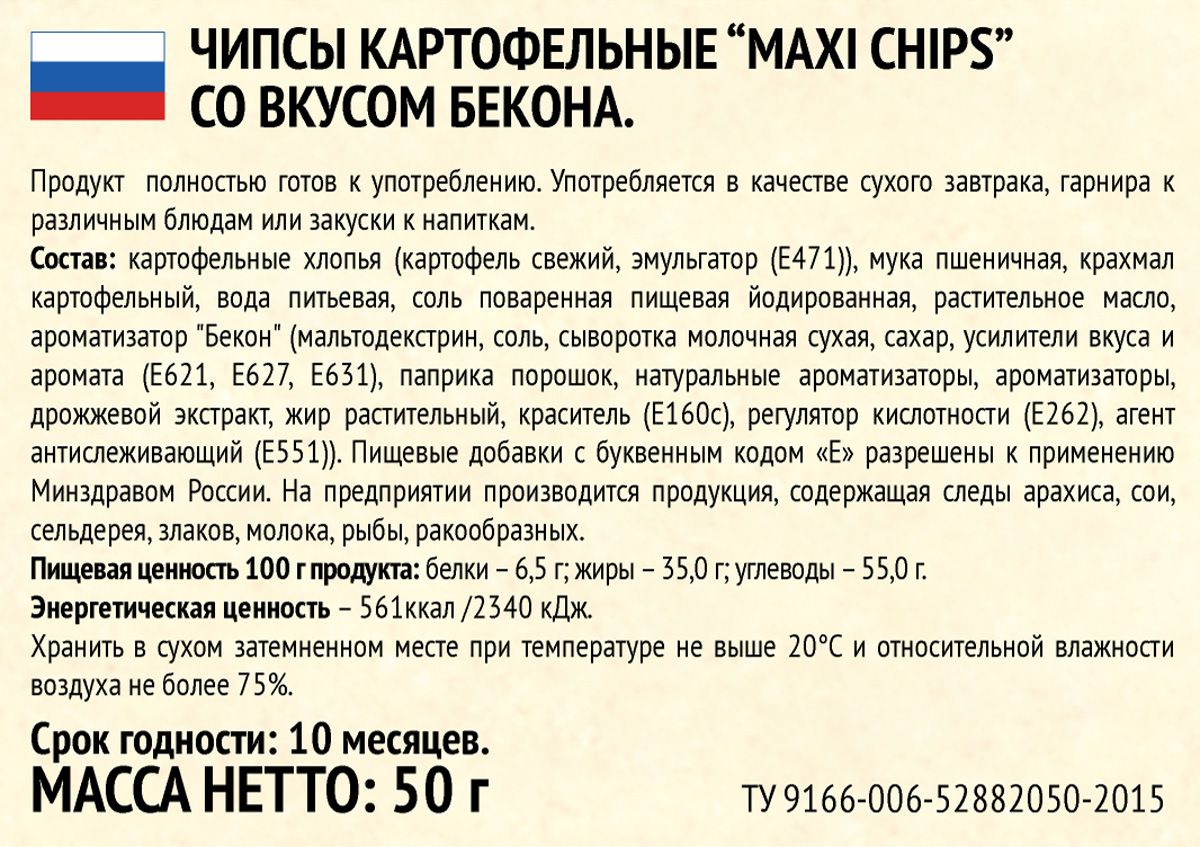 - Состав: картофельные хлопья (картофель свежий, эмульгатор(Е471)), мука пшеничная, крахмал картофельный, вода питьевая, растительное масло, соль поваренная пищевая йодированная (соль, агент антислеживающий Е536), ароматизатор "Бекон" (мальтодекстрин, соль, сыворотка молочная сухая, сахар, усилители вкуса и аромата (Е621, Е627, Е631), паприка порошок, натуральные ароматизаторы, ароматизаторы, дрожжевой экстракт, жир растительный, краситель (Е160с), регулятор кислотности(Е262), агент антислеживающий (Е551)). Пищевые добавки с буквенным кодом "E" разрешены к применению Минздравом России. На предприятии производится продукция, содержащая следы арахиса, горчицы, сои, сельдерея, злаков, молока, рыбы, ракообразных.
