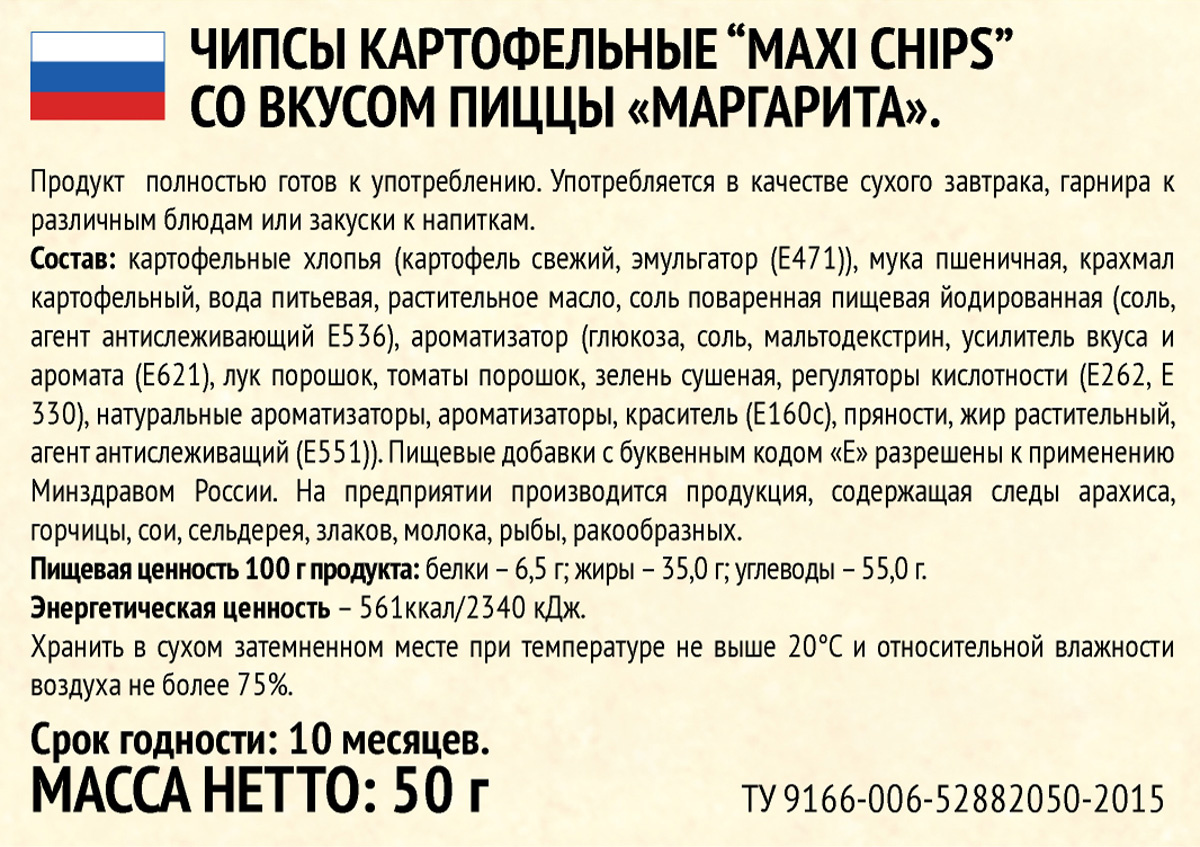 - Состав: картофельные хлопья (картофель свежий, эмульгатор(Е471)), мука пшеничная, крахмал картофельный, вода питьевая, растительное масло, соль поваренная пищевая йодированная (соль, агент антислеживающий Е536), ароматизатор (глюкоза, соль, мальтодекстрин, усилитель вкуса и аромата (Е621), лук порошок, томаты порошок, зелень сушеная, регуляторы кислотности (Е262, Е330), натуральные ароматизаторы, ароматизаторы, краситель (Е160с), пряности, жир растительный, агент антислеживащий (Е551)). Пищевые добавки с буквенным кодом "E" разрешены к применению Минздравом России. На предприятии производится продукция, содержащая следы арахиса, горчицы, сои, сельдерея, злаков, молока, рыбы, ракообразных.