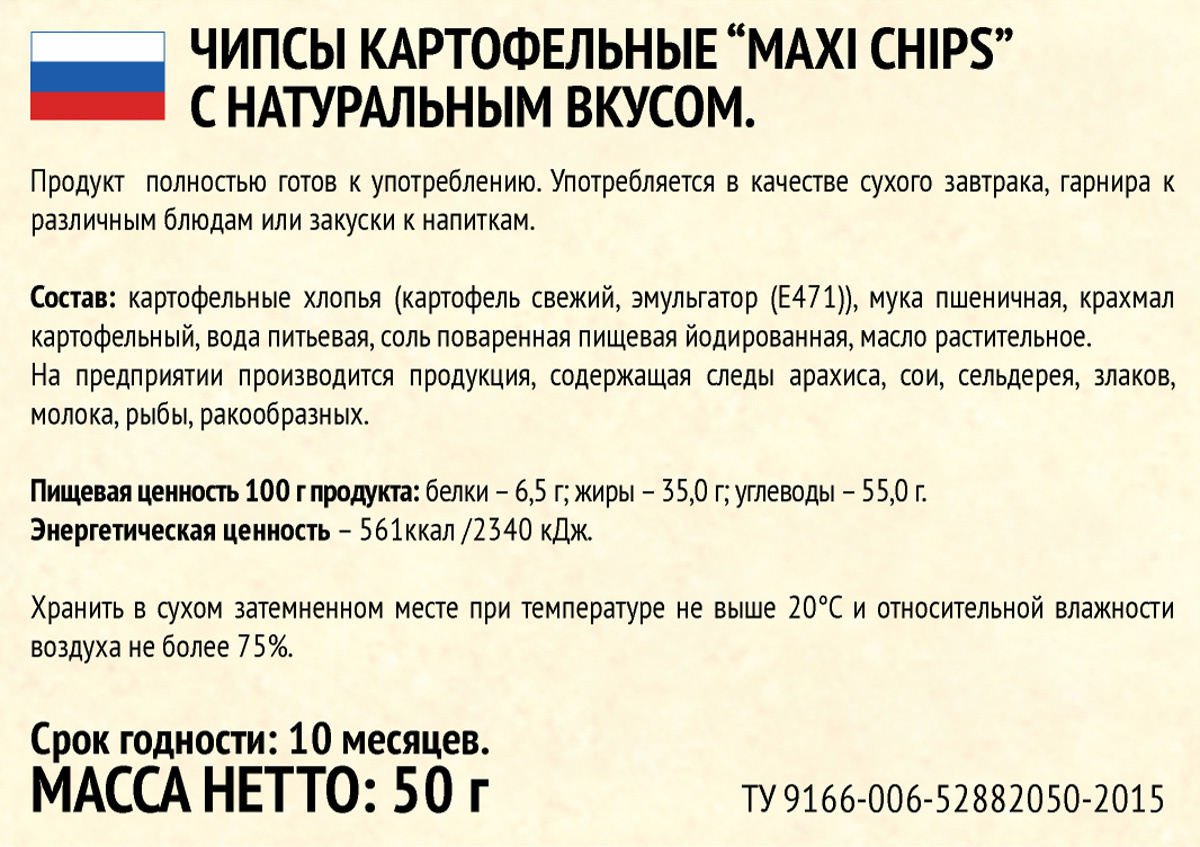 - Состав: картофельные хлопья (картофель свежий, эмульгатор(Е471)), мука пшеничная, крахмал картофельный, вода питьевая, растительное масло, соль поваренная пищевая йодированная (соль, агент антислеживающий Е536). Пищевые добавки с буквенным кодом "Е" разрешены к применению Минздравом России. На предприятии производится продукция, содержащая следы арахиса, горчицы, сои, сельдерея, злаков, молока, рыбы, ракообразных.