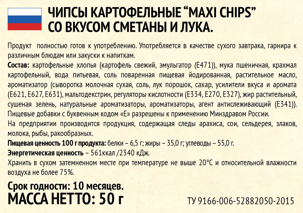 - Состав: картофельные хлопья (картофель свежий, эмульгатор(Е471)), мука пшеничная, крахмал картофельный, вода питьевая, растительное масло, соль поваренная пищевая йодированная (соль, агент антислеживающий Е536), ароматизатор (сыворотка молочная сухая, соль, лук порошок, сахар, усилители вкуса и аромата (Е621, Е627, Е631), мальтодекстрин, регуляторы кислотности (Е334, Е270, Е327), жир растительный, сушеная зелень, натуральные ароматизаторы, ароматизаторы, агент антислеживающий (Е341)). Пищевые добавки с буквенным кодом "E" разрешены к применению Минздравом России. На предприятии производится продукция, содержащая следы арахиса, горчицы, сои, сельдерея, злаков, молока, рыбы, ракообразных.