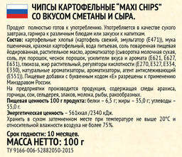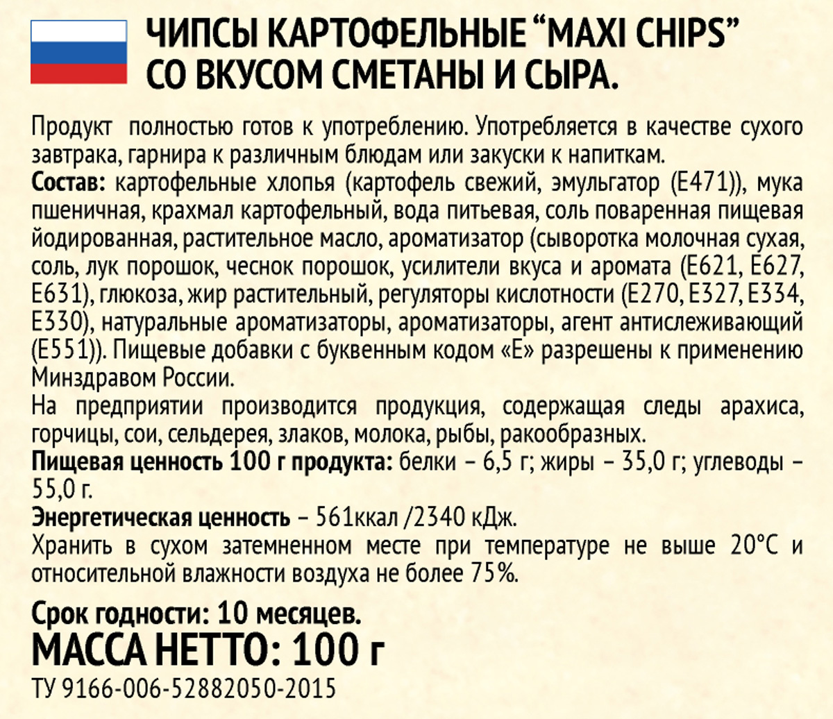 - Состав: картофельные хлопья (картофель свежий, эмульгатор (Е471)), мука пшеничная, крахмал картофельный, вода питьевая, растительное масло, соль поваренная пищевая йодированная (соль, агент антислеживающий Е536), ароматизатор (сыворотка молочная сухая, соль, лук порошок, чеснок порошок, усилители вкуса и аромата (Е621, Е627, Е631), глюкоза, жир растительный, регуляторы кислотности (Е270, Е327, Е334, Е330), натуральные ароматизаторы, ароматизаторы, агент антислеживающий (Е551)).Пищевые добавки с буквенным кодом «E» разрешены к применению Минздравом России.На предприятии производится продукция, содержащая следы арахиса, горчицы, сои, сельдерея, злаков, молока, рыбы, ракообразных.