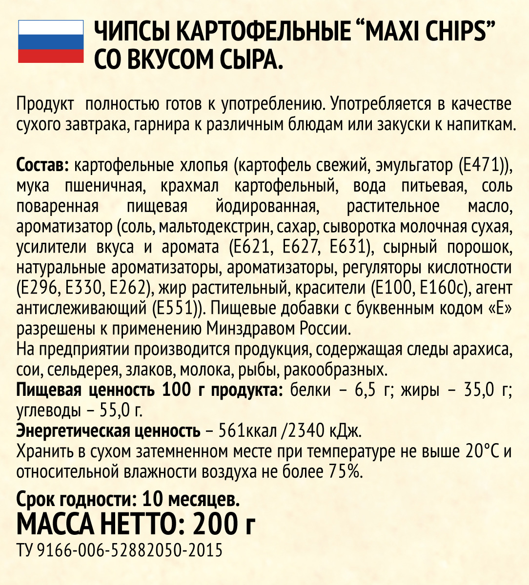 - Состав: картофельные хлопья (картофель свежий, эмульгатор(Е471)), мука пшеничная, крахмал картофельный, вода питьевая, растительное масло, соль поваренная пищевая йодированная (соль, агент антислеживающий Е536), ароматизатор (соль, мальтодекстрин, сахар, сыворотка молочная сухая, усилители вкуса и аромата (Е621, Е627, Е631), сырный порошок, натуральные ароматизаторы, ароматизаторы, регуляторы кислотности (Е296, Е330, Е262), жир растительный, красители (Е100, Е160с), агент антислеживающий (Е551)). Пищевые добавки с буквенным кодом "E" разрешены к применению Минздравом России. На предприятии производится продукция, содержащая следы арахиса, горчицы, сои, сельдерея, злаков, молока, рыбы, ракообразных.