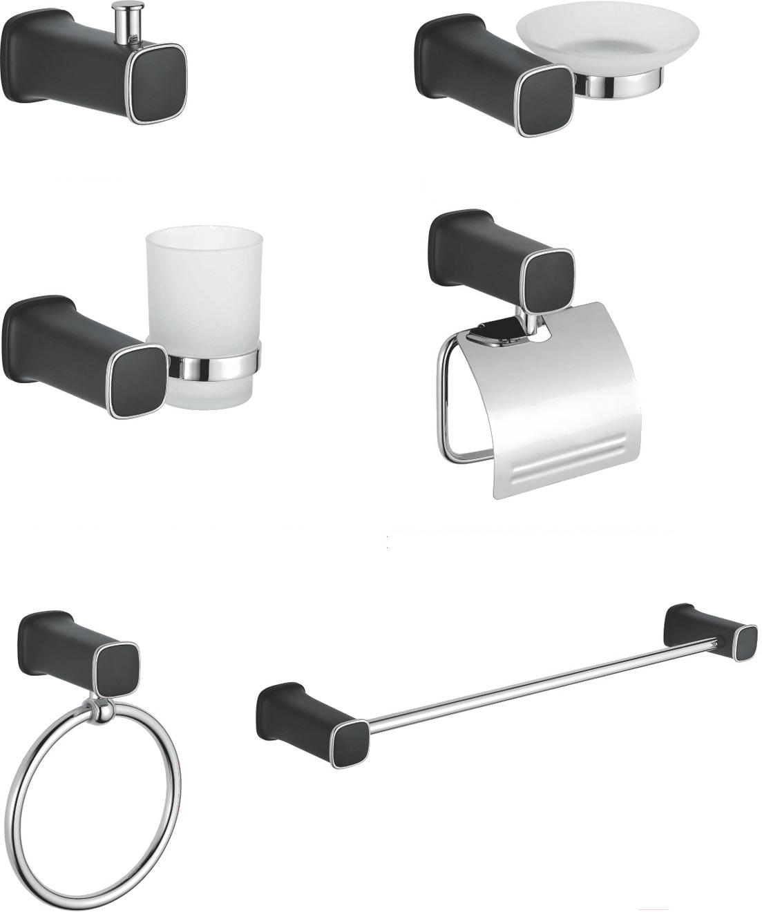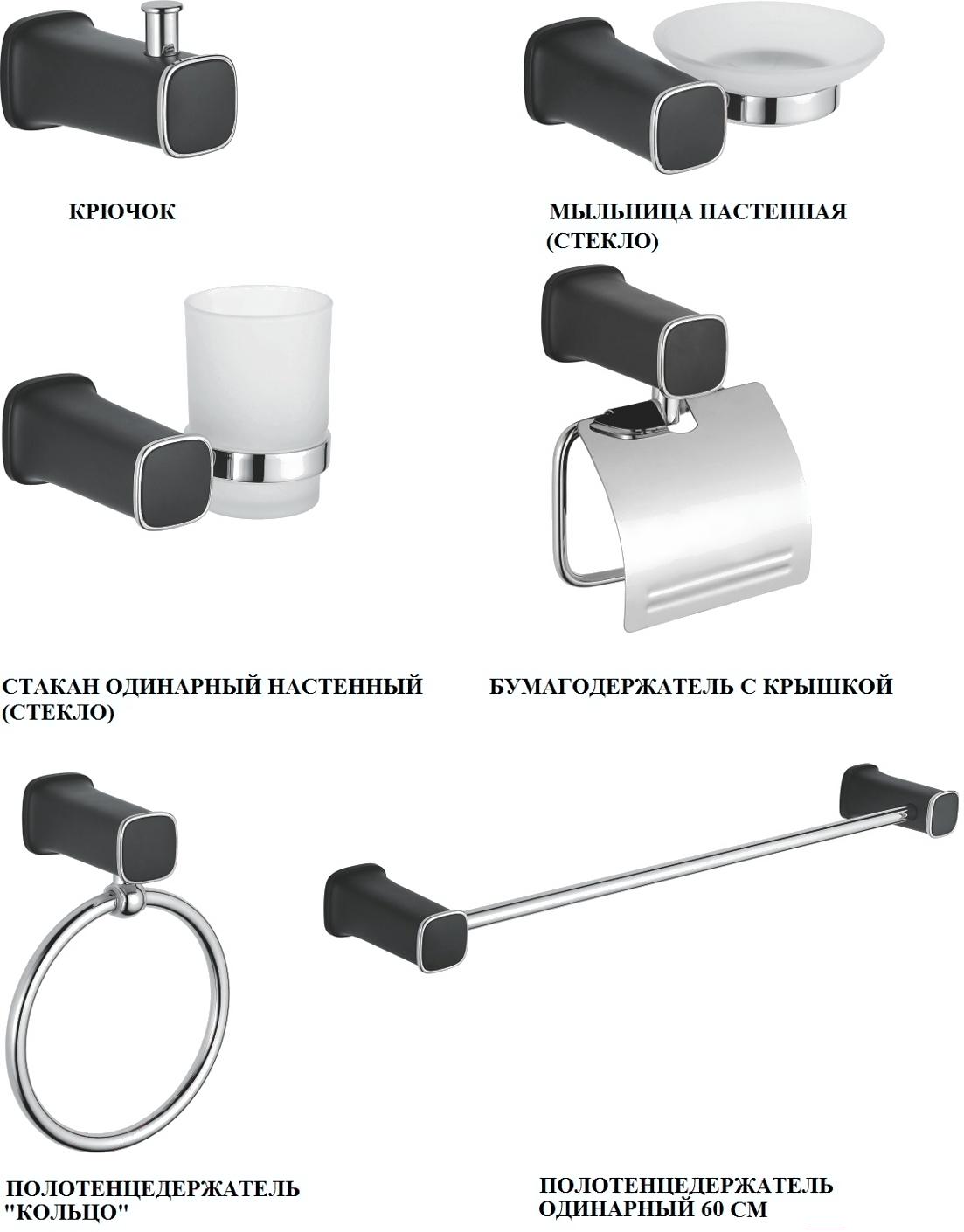 • Комплектация набора держатель для полотенца, кольцо для полотенца, мыльница, стакан для зубных щеток, держатель для туалетной бумаги, крючок