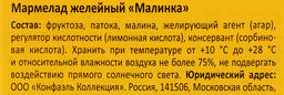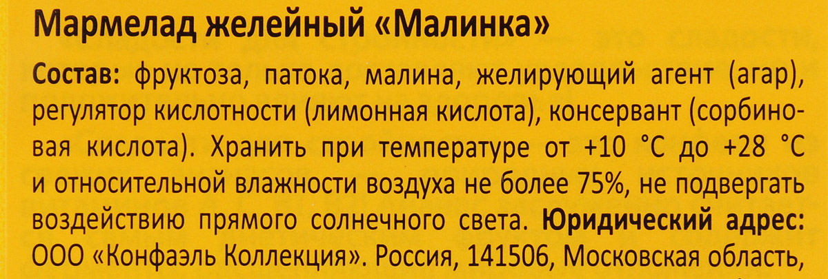 - Состав Фруктоза, патока, малина, желирующий агент (агар), регулятор кислотности (лимонная кислота), консервант (сорбиновая кислота)