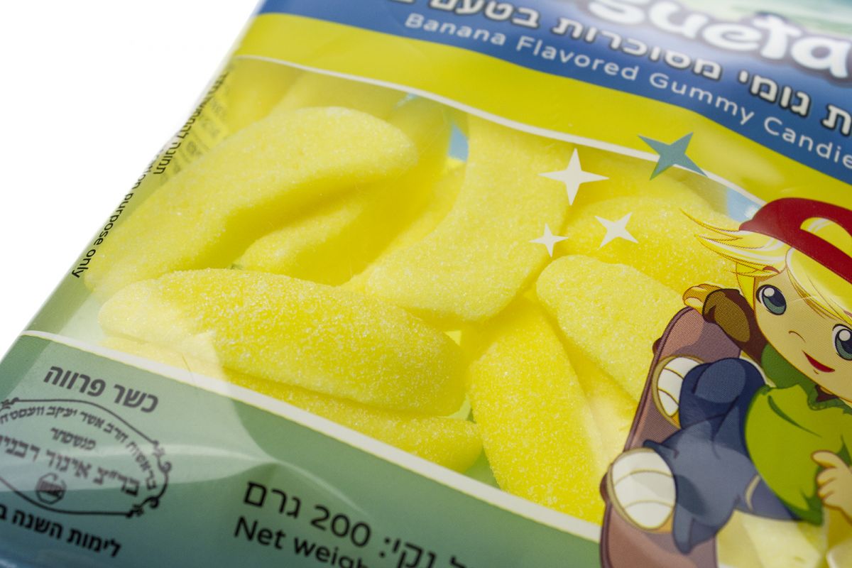 - Состав: Сироп глюкозы (содержит сульфит), белый сахар, вода, кашерный рыбий желатин, пищевые кислоты (яблочная кислота, лимонная кислота), загуститель (пектин), ароматизаторы и вкусовые добавки, пищевой краситель (тартразин Е-102). Продукт содержит около 3% сахарной глазури