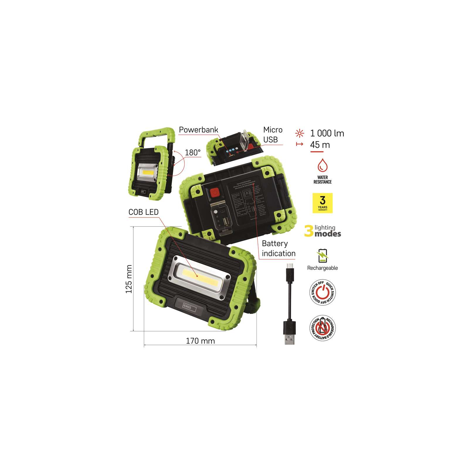 Унікальний ліхтар-прожектор P4533 потужністю 10W від чеського виробника EMOS . Ліхтар має поворотну ніжку для зручної фіксації. Ємна батарея і наявність USB роз'єму дозволяє використовувати цей пристрій як POWER BANK для заряду інших пристроїв. Корпус з ударостійкого АБС пластику охороняє прожектор при падінні з висоти. Ліхтар має функцію швидкого вимикання і захист акумулятора.