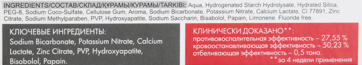 - Состав: Aqua, Hydrogenated Starch Hydrolysate, Hydrated Silica, PEG-8, Sodium Coco-Sulfate, Cellulose Gum, Aroma, Sodium Bicarbonate, Potassium Nitrate, Calcium Lactate, CI 77891, Zinc Citrate, Sodium Methylparaben, PVP, Hydroxyapatite, Sodium Saccharin, Bisabolol, Papain, Limonene. Fluoride free.