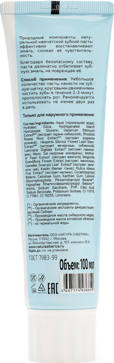 - Состав: Aqua (термальная вода), Hydrated Silica, Hydrogenated Starch Hydrolysate, Glycerin, Geranium Sibiricum ExtractWH (экстракт герани сибирской), Rhodiola Rosea Root ExtractWH (экстракт родиолы розовой), Hesperis Sibirica ExtractWH (экстракт вечерницы сибирской), Laminaria Digitata Extract* (экстракт ламинарии), Maris Sal (морские минералы), Mother of Pearl Extract (экстракт жемчуга), Magnolia Grandiflora Flower Extract (экстракт магнолии), Camellia Sinensis Leaf Extract* (экстракт зеленого чая), Kaolin (белая глина), Rubus Idaeus Fruit Extract* (экстракт малины), Cocamidopropyl Betaine, Cellulose Gum, Xanthan Gum, Calcium Glycerophosphate, Pineamidopropyl BetainePS, Hippophae Rhamnoidesamidopropyl BetaineHR, Aroma, Sodium Saccharin, PVP, Citric Acid, Sodium Benzoate, Potassium Sorbate, CI 77019, CI 77891, CI 16255, Limonene. (*) - Органические ингредиенты, (WH) - Органические экстракты дикорастущих растений Сибири (PS) - Производное масла сибирского кедра, (HR) - Производное масла алтайской облепихи *из термальной воды