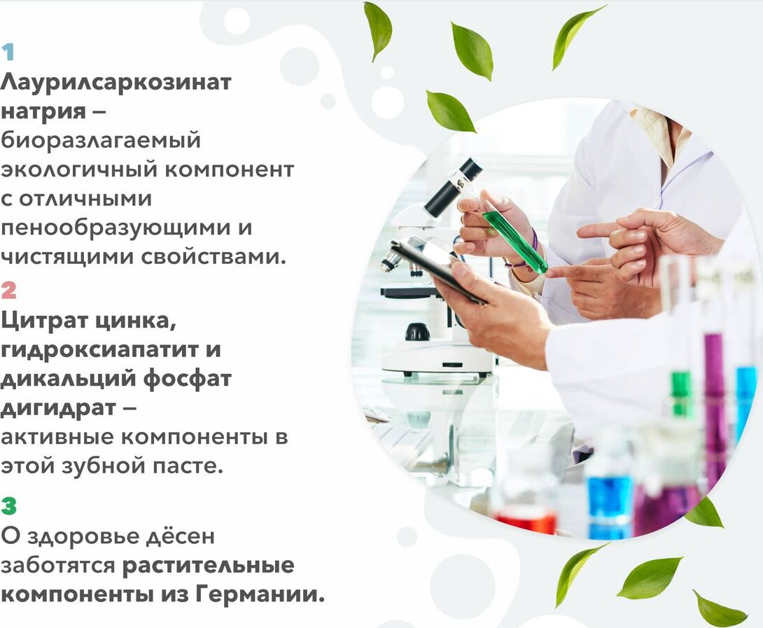 • Состав: Вода питьевая, Сорбитол, Кремния диоксид, Глицерин, Дикальцийфосфат дигидрат, Натрия карбоксиметилцеллюлоза, Натрия лаурилсаркозинат, Ароматическая композиция, Гидроксиацетофенон, Ксилит, Цитрат цинка, Экстракт ромашки, Экстракт крапивы, Гидроксиапатит, Кремния диоксид (Sorbosil BFG), Бисаболол, Стевиозид, Ментол натуральный кристаллический, Биозол, Витаминный комплекс из Швейцарии.