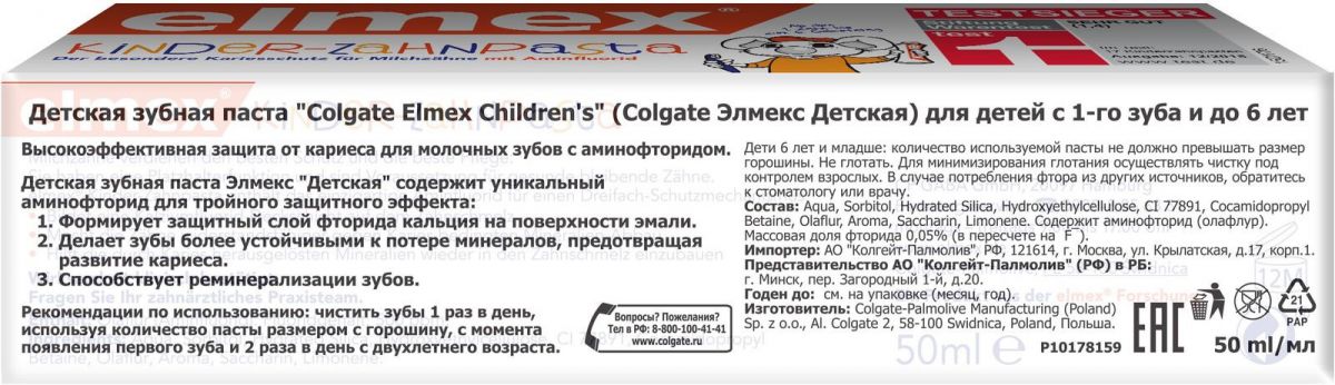Colgate Зубная паста "Elmex", детская, для детей с 1-го зуба и до 6 лет, 50 мл