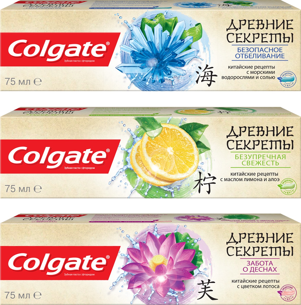 - Состав: 1. Colgate Зубная паста Древние секреты "Безопасное отбеливание", 75 мл. Состав:.Sorbitol, Aqua, Hydrated Silica, Sodium Lauryl Sulfate, Aroma, PEG-12, Sodium Chloride, Cellulose Gum, Tetrasodium Pyrophosphate, Cocamidopropyl Betaine, Sodium Saccharin, Sodium Fluoride, Mica, Algin, Eugenol, CI 77891, CI 42090 ; 2. Colgate Зубная паста Древние секреты "Безупречная свежесть", 75 мл. Состав: Sorbitol, Aqua, Hydrated Silica, Sodium Lauryl Sulfate, Aroma, PEG-12, Cellulose Gum, Cocamidopropyl Betaine, Sodium Saccharin, Sodium Fluoride, Mica, Nelumbo Nucifera Leaf Extract, Nelumbo Nucifera Flower Extract, Limonene, CI 77891, CI 16035Sorbitol, Aqua, Hydrated Silica, Sodium Lauryl Sulfate, Aroma, PEG-12, Cellulose Gum, Tetrasodium, Pyrophosphate, Cocamidopropyl Betaine, Sodium Saccharin, Sodium Fluoride, Mica, Aloe Barbadensis Leaf Extract, Citrus Limon Peel Oil, Citral, Eugenol, Limonene, CI 77891, CI 47005, CI 74260; 3. Colgate Зубная паста Древние секреты "Забота о деснах", 75 мл. Состав: