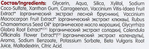 - Состав: Glycerin, Aqua, Silica, Xylitol, Sodium Coco-Sulfate, Xanthan Gum, Carrageenan, Vaccinium Vitis-Idaea Fruit Extract(*) (органический экстракт лесной брусники), Vaccinium Macrocarpon Fruit Extract(*) (органический экстракт клюквы), Rubus Chamaemorus Seed Oil(*) (органическое масло морошки), Glycyrrhiza Glabra Root Extract(*)(OF) (органический экстракт солодки), Calendula Officinalis Flower Extract(*)(OF) (органический экстракт календулы), Aroma, Sodium Benzoate, Potassium Sorbate, Beta Vulgaris Root Juice, Maltodextrin, Citric Acid.
