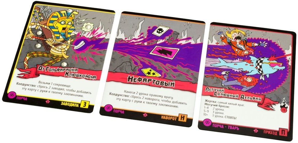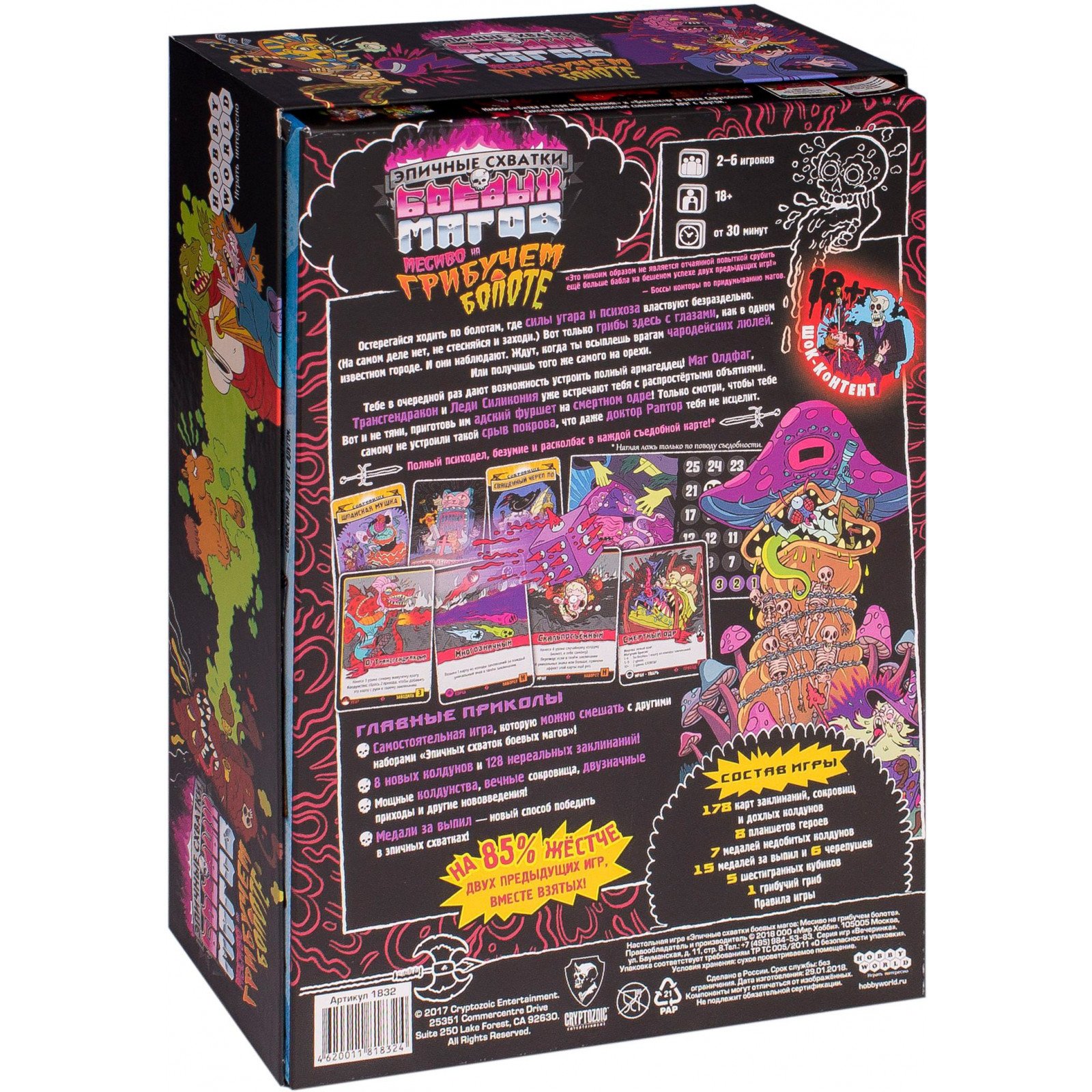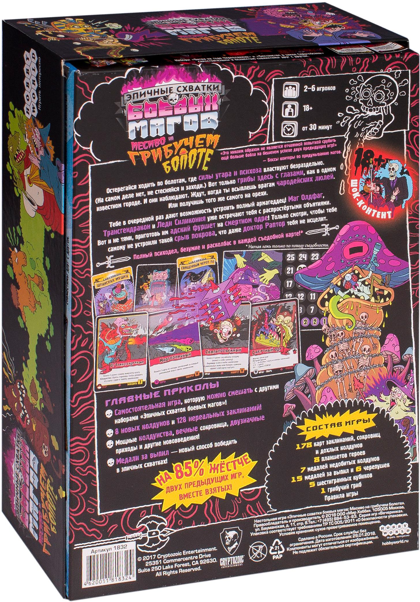 • Комплектация 178 карт заклинаний, сокровищ и дохлых колдунов, 8 планшетов героев, 7 медалей недобитых колдунов, 15 медалей за выпил и 6 черепушек, 5 шестигранных кубиков, 1 грибучий гриб, правила игры