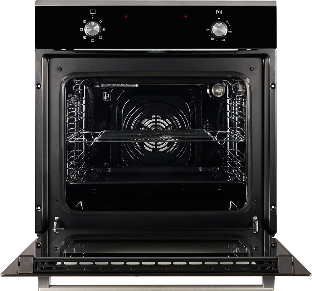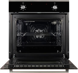 Электрический духовой шкаф, объем 58 л, мощность подключения 2900 Вт, класс энергопотребления A, максимальная температура 250 °С, способ очистки аквачистка, переключатели утапливаемые поворотные, гриль электрический, дверца духовки откидная, ширина ниши для встраивания 56 см.