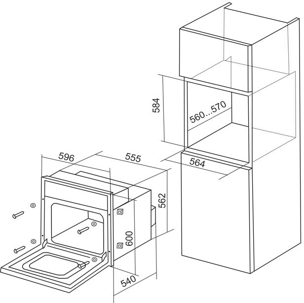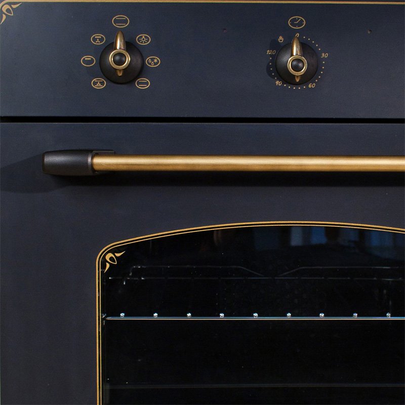 Электрический духовой шкаф, объем 58 л, мощность подключения 2200 Вт, класс энергопотребления A, максимальная температура 250 °С, способ очистки ручной, переключатели поворотные, количество стекол 2, гриль электрический, дверца духовки откидная, таймер звуковой, ширина ниши для встраивания 56.4 см.