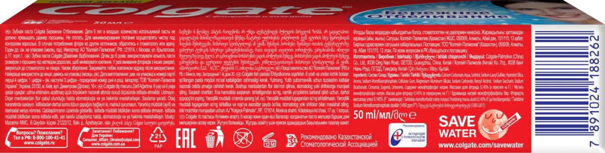 • Состав: карбонат кальция очищает эмаль вода сорбитол гидратированный диоксид кремния аурилсульфат натрия вкусовая монофторфосфат натрия 1,1% (1450 ppm F-) натриевая соль КМЦ алюмосиликат магния карбонат натрия бензиловый спирт сахаринат натрия бикарбонат натрия d-лимонен циннамаль эвгенол