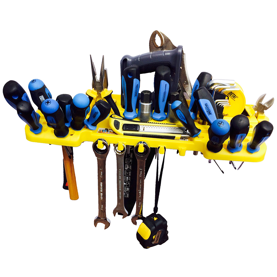 Полка-органайзер крепится на стену в гараже, мастерской или дома для компактного и удобного хранения инструментов.