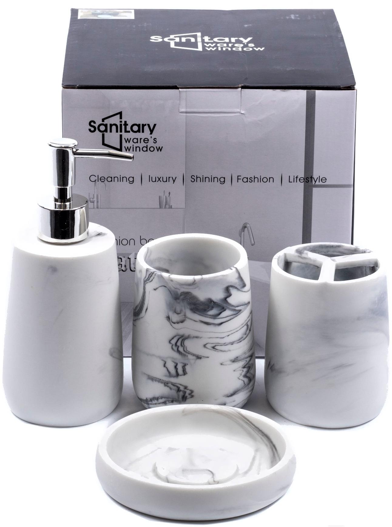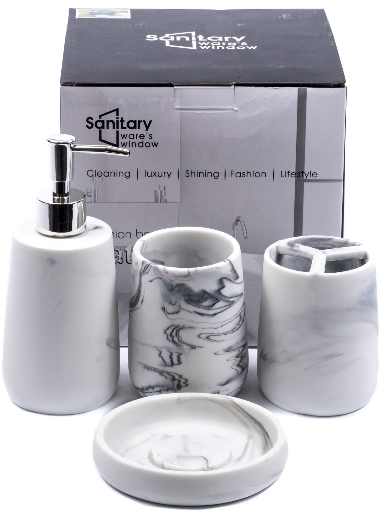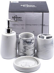 - Комплектация дозатор жидкого мыла, мыльница, стакан для зубных щеток, стакан косметический