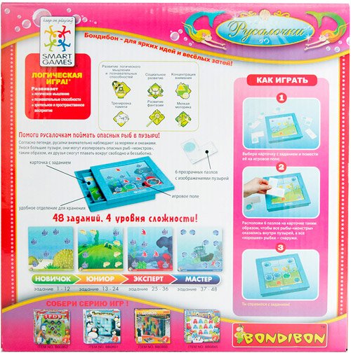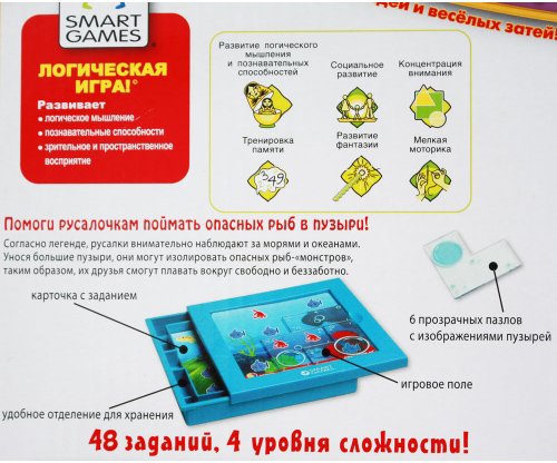 Детская логическая настольная игра с четырьмя уровнями сложности. Собирая пазл, ребенок развивает: внимательность и сообразительность, координирование работы глаз и кистей рук, концентрацию внимания, умение работать по шаблону и выполнять поставленные задания. В комплекте: пластиковый бокс с отделом для хранения карточек с заданиями, карточки с заданиями (48 заданий, 4 уровня сложности), 6 прозрачных пластиковых пазлов с изображениями пузырей, игровое поле.