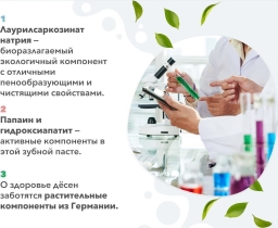 • Состав: Вода питьевая, Сорбитол, Кремния диоксид, Кремния диоксид, Глицерин, Дикальцийфосфат дигидрат, Натрия карбоксиметилцеллюлоза, Натрия лаурилсаркозинат, Ароматическая композиция, Гидроксиацетофенон, Ксилит, Цитрат цинка, Гидроксиапатит, Экстракт шиповника, Экстракт клевера, Кремния диоксид (Sorbosil BFG), Бисаболол, Стевиозид, Ментол натуральный кристаллический, Биозол, Фермент папаин, Витаминный комплекс из Швейцарии.