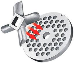Мясорубка мощностью 1500 Вт; производительность 1,5 кг/мин; система реверса; насадки: для приготовления колбас; отсек для хранения шнура.