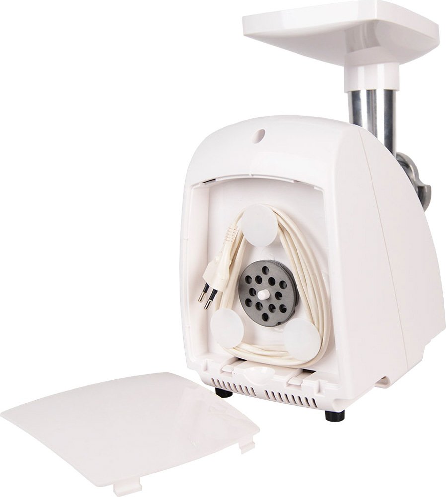 Мясорубка мощностью 1500 Вт; производительность 1.66 кг/мин; насадки: кеббе, для приготовления колбас; отсек для хранения шнура; отсек для хранения насадок.