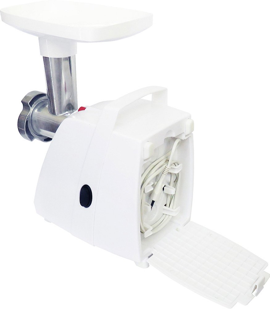 Мясорубка мощностью 1500 Вт; производительность 1.66 кг/мин; насадки: кеббе, для приготовления колбас; отсек для хранения шнура; отсек для хранения насадок.