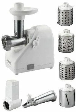 Мясорубка мощностью 1500 Вт; производительность 0.6 кг/мин; насадки: для приготовления колбас, для соков, для шинковки, терка; отсек для хранения шнура.