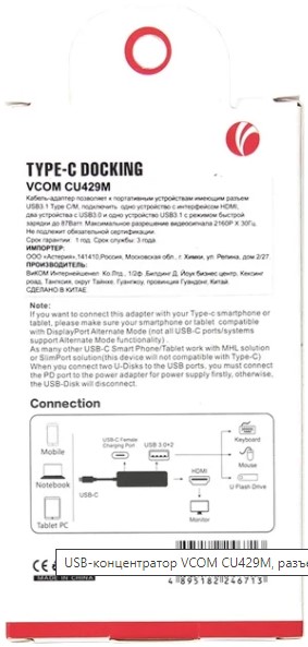 Хаб позволяет подключить к портативным устройствам, имеющим разъём USB3.1 Type C/M, одно устройство с интерфейсом HDMI, два устройства с USB3.0 и одно устройство USB3.1 с режимом быстрой зарядки до 87 ватт.