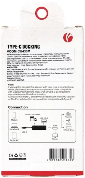 Док-станция с 3 разъемами. HDMI разъем поддерживает 2160P@30HZ; поддержка MicroSD/SD карт объемом до 128 Гб; скорость передачи данных до 5Gbps