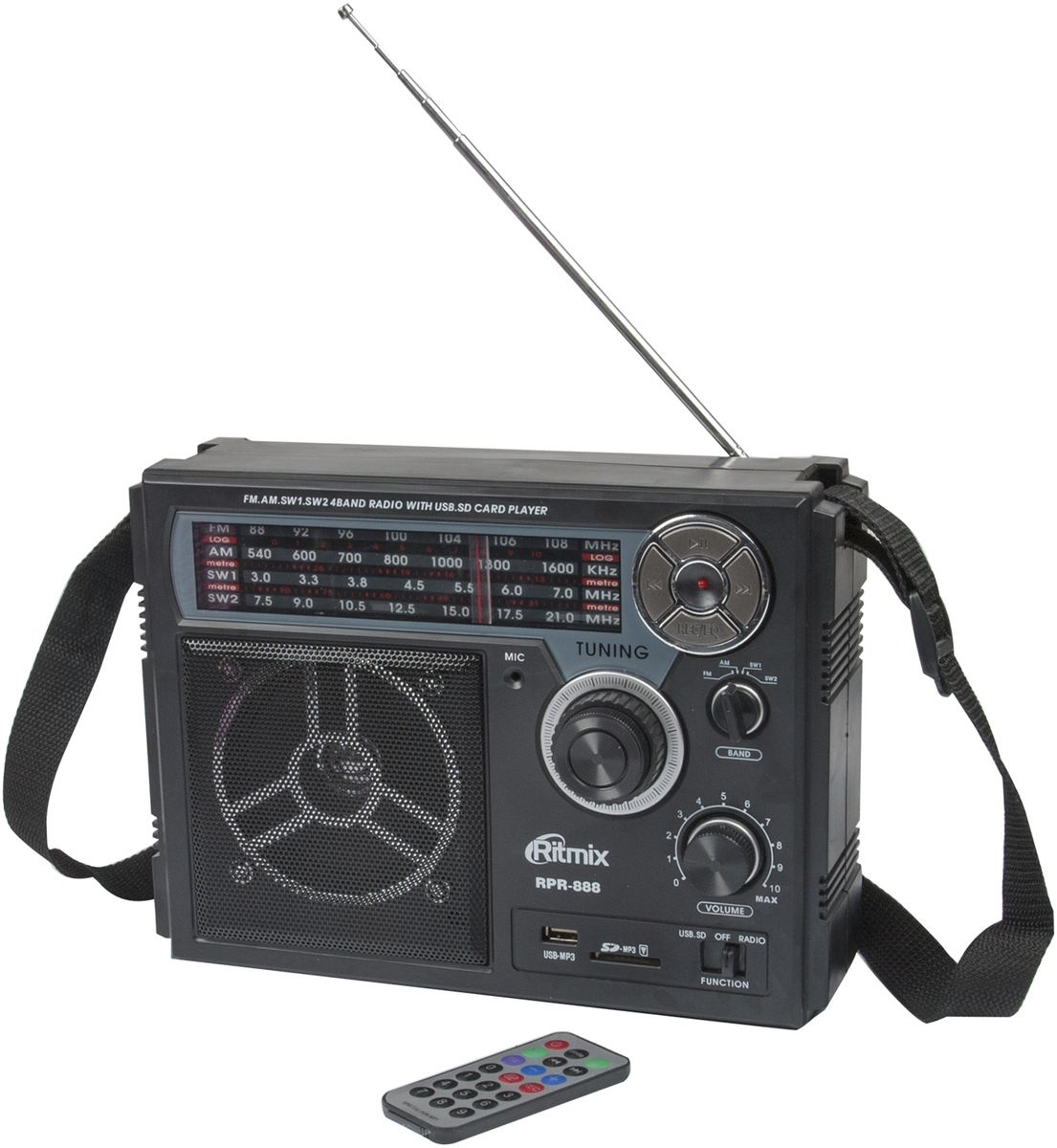 - Комплектация: Радиоприёмник, ремень для переноски, кабель питания от сети, пульт управления mp3-плеером, инструкция, гарантийный талон