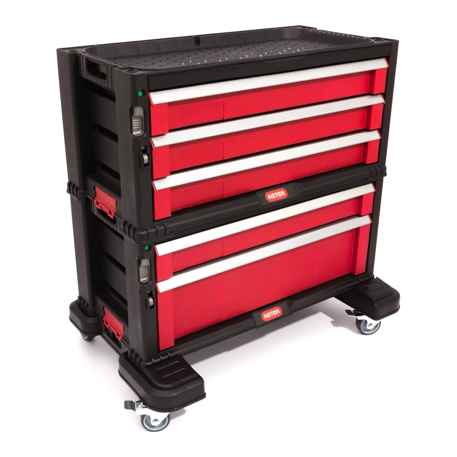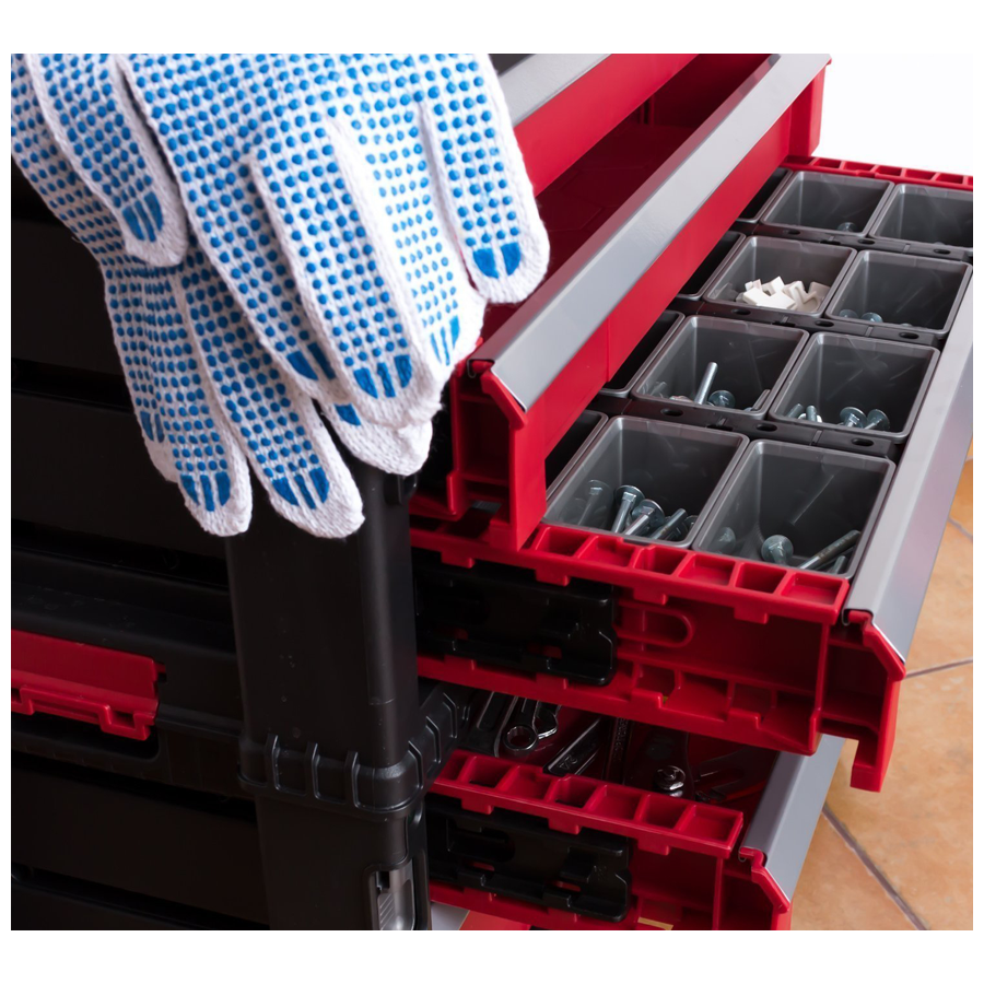 Система предназначена для организации хранения инструментов и деталей, состоит из двух модулей, закрепленных между собой встроенными защелками и имеет 5 ящиков. Это отличное решение для гаража, подвала или балкона. Благодаря удобным рукояткам ящики легко переместить на нужное место. Надежное и универсальное складирование Запорная система с центральным замком 16 съемных ячеек для мелких деталей Съемные перегородки Встроенные ручки для переноски Фиксируемые шарнирные ролики