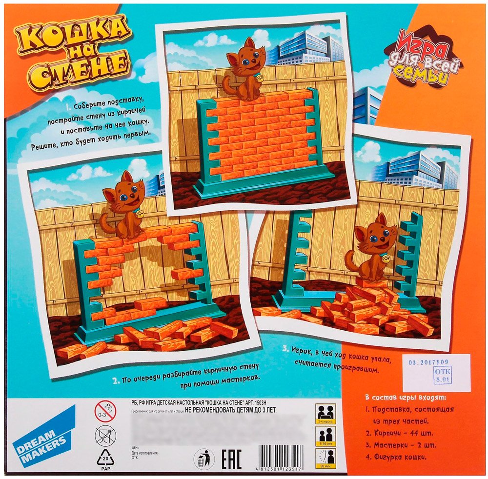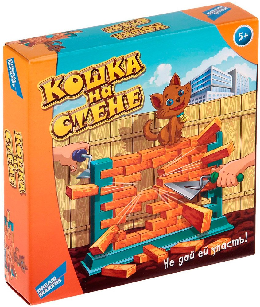 Увлекательная и простая игра для всей семьи, в которой игрокам предстоит снять со стены кошку. Перед началом игры из специальной подставки и кирпичиков строится стена. Сверху на нее ставится фигурка кошки. Задача игроков - в свой ход при помощи мастерков аккуратно вынимать по одному кирпичику из стены.