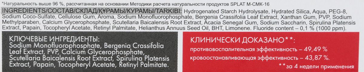 - Состав: Hydrogenated Starch Hydrolysate, Hydrated Silica, Aqua, PEG-8, Sodium Coco-Sulfate, Cellulose Gum, Aroma, Sodium Monofluorophosphate, Bergenia Crassifolia Leaf Extract, Xanthan Gum, PVP, Sodium Methylparaben, Calcium Glycerophosphate, Scutellaria Baicalensis Root Extract, Acacia Senegal Gum, Sodium Saccharin, Spirulina Platensis Extract, Papain, Tocopheryl Acetate, Retinyl Palmitate, Helianthus Annuus Seed Oil, BHT, Limonene. Fluoride content – 0,1 % (1000 ppm).