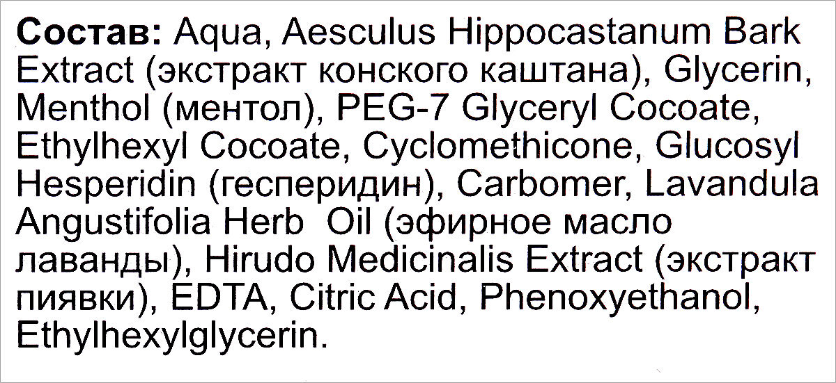 - Состав: Aqua, Aesculus Hippocastanum Bark Extract (экстракт конского каштана), Glycerin, Menthol (ментол), PEG-7 Glyceryl Cocoate, Ethylhexyl Cocoate, Cyclomethicone, Glucosyl Hesperidin (гесперидин), Carbomer, Lavandula Angustifolia Herb Oil (эфирное масло лаванды), Hirudo Medicinalis Extract (экстракт пиявки), EDTA, Citric Acid, Diazolidinyl Urea, 2-bromo-2-nitropropane-1,3-diol.