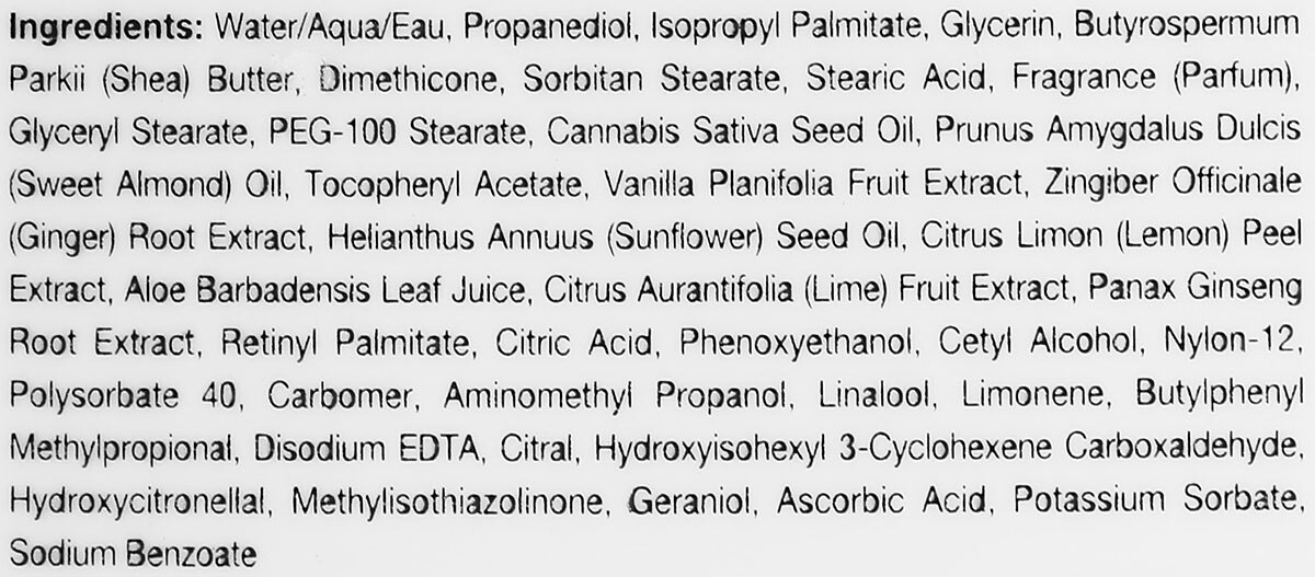 - Состав Экстракт семян конопли, протеины и аминокислоты конопли, витаминный комплекс A, C, E, экстракт ванили, имбиря
