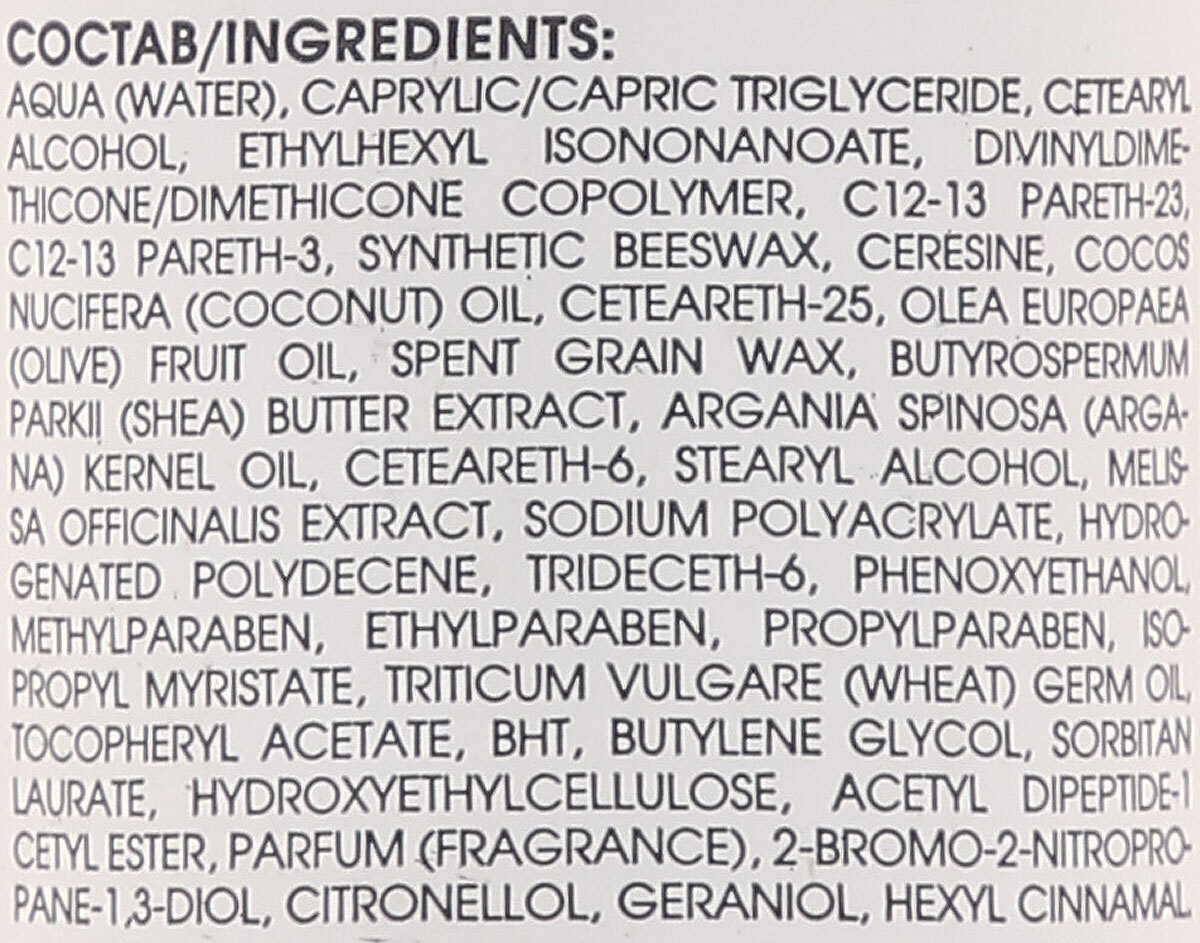 - Состав: Вода, глицерилтрикаприлат/капрат, цетеариловый спирт, этилгексилизононаноат, дивинилдиметикон / диметикон сополимер, C12-13 парет-23, C12-13 парет-3, воск пчелиный синтетический, церезин, масло Cocos Nucifera (кокоса), цетеарет-25, масло плодов Olea Europaea (оливковое), воск пивной дробины, экстракт масла Butyrospermum Parkii (ши), масло косточек Argania Spinosa (арганы), цетеарет-6, стеариловый спирт, экстракт Melissa Officinalis (мелиссы), полиакрилат натрия, гидрогенизированный полидецен, тридецет-6, феноксиэтанол, метилпарабен, этилпарабен, пропилпарабен, изопропилмиристат, масло зародышей Triticum vulgare (пшеницы), токоферилацетат, БГТ, бутиленгликоль, сорбитанлаурат, гидроксиэтилцеллюлоза, ацетилдипептид-1 цетиловый эфир, парфюмерная композиция, 2-бром-2-нитропропан-1,3-диол, цитронеллол, гераниол, гексилциннамаль
