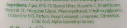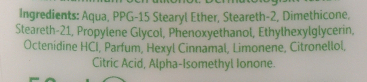 - Состав: Aqua, PPG-15 Stearyl Ether, Steareth-2, Cyclopentasiloxane, Steareth-21, Propylene Glycol, Glycerin, Ethylhexylglycerin, Phenoxyethanol, Octenidine HCI, Citric Acid, Parfum, Hexyl Cinnamal, Limonene, Citronellol, Alpha-Isomethyl Ionone