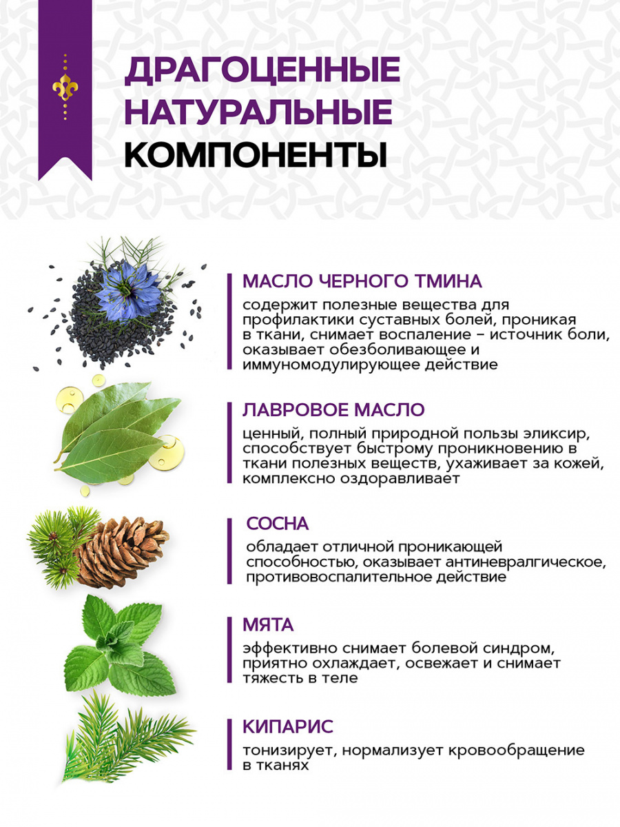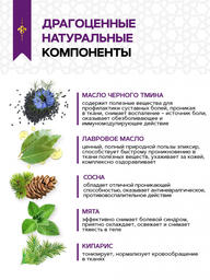 - Состав: Масла: оливковое, лавровое, черного тмина, корицы; камфора, лимона эфирное масло, сосны эфирное масло, кипариса эфирное масло, бергамота эфирное масло, мяты эфирное масло.