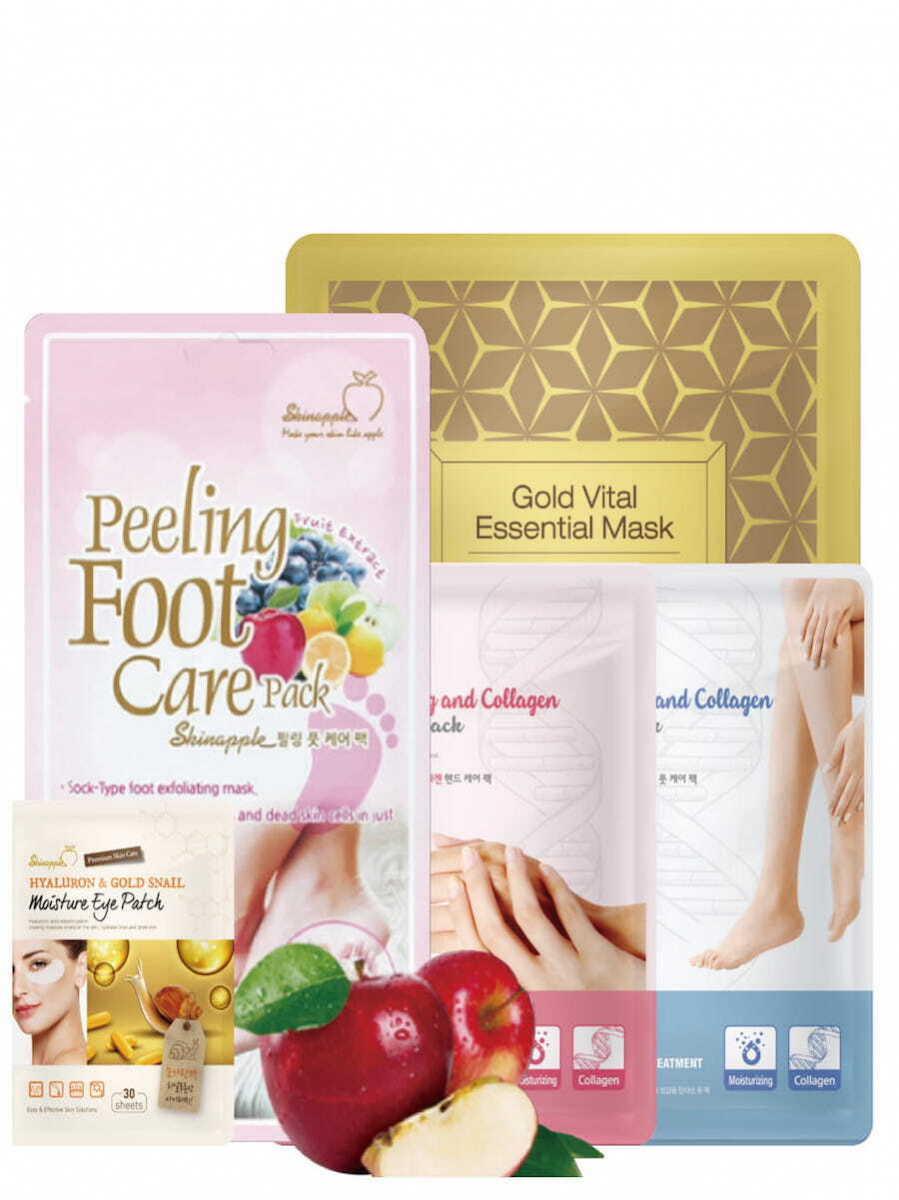 - Комплектация: 1 пара педикюрных носочков отшелушивающих 1 пара увлажняющих масок-перчаток для рук с коллагеном 1 пара увлажняющих масок-носочков для ног с коллагеном 1 маска маска под глаза(2 патча) с коллагеном и муцином улитки 1 маска для лица «Жизненная сила золота»