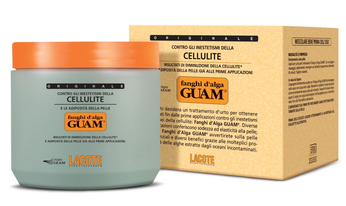 - Состав: морская вода, экстракт водорослей GUAM (ламинария, фукус) – более 21%, фуллерова земля (глина), фитоэкстракты плюща, конского каштана, «разогревающие» эфирные масла душицы, лимона.